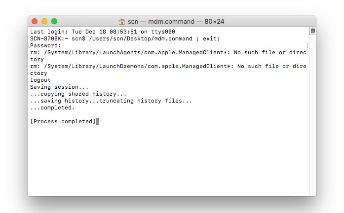 sudo mkdir /System/Library/LaunchAgentsDisabled; sudo mkdir /System/Library/LaunchDaemonsDisabled; sudo mv /System/Library/LaunchAgents/com.apple.ManagedClientAgent.agent.plist /System/Library/LaunchAgentsDisabled; sudo mv /System/Library/LaunchAgents/com.apple.ManagedClientAgent.enrollagent.plist /System/Library/LaunchAgentsDisabled; sudo mv /System/Library/LaunchDaemons/com.apple.ManagedClient.cloudconfigurationd.plist /System/Library/LaunchDaemonsDisabled; sudo mv /System/Library/LaunchDaemons/com.apple.ManagedClient.enroll.plist /System/Library/LaunchDaemonsDisabled; sudo mv /System/Library/LaunchDaemons/com.apple.ManagedClient.plist /System/Library/LaunchDaemonsDisabled; sudo mv /System/Library/LaunchDaemons/com.apple.ManagedClient.startup.plist /System/Library/LaunchDaemonsDisabled