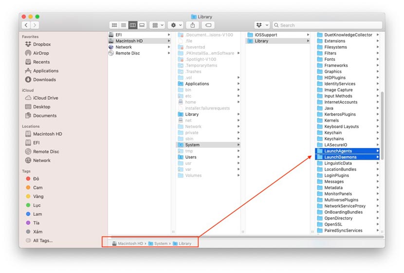 + /System/Library/LaunchAgents và xóa file com.apple.ManagedClientAgent.enrollagent.plist