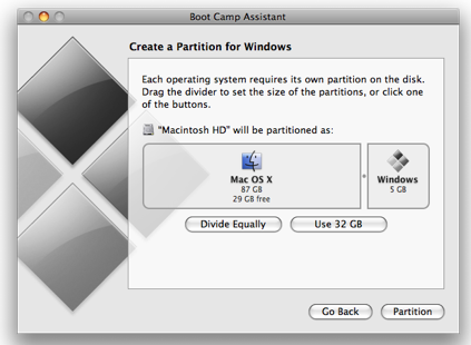 - Bạn có thể tuỳ biến dung lượng ổ Win của mình . Nếu muốn chia đôi ổ cứng chọn Divide Equally