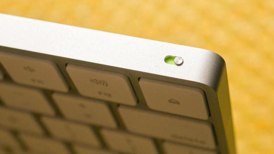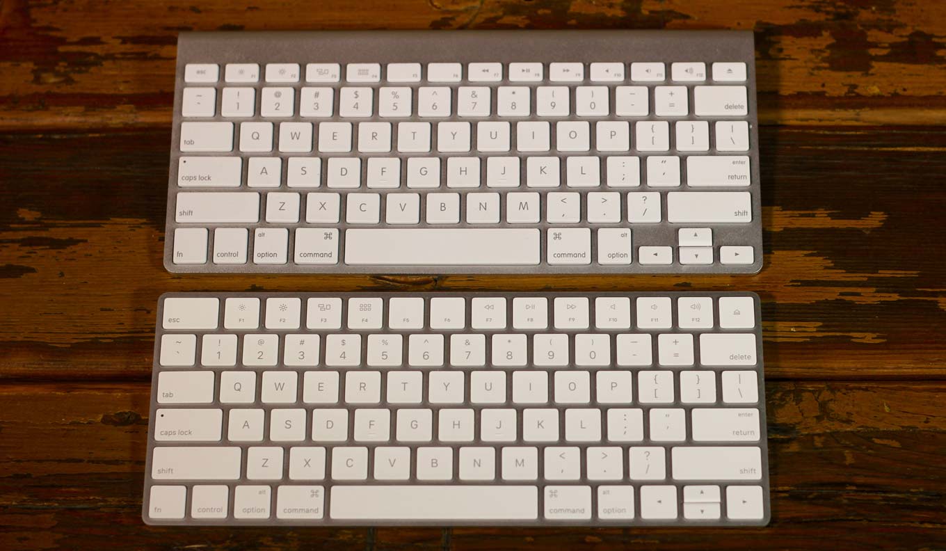 Bàn phím Wireless Keyboard cũng được Apple thay đổi khá nhiều với một số tinh chỉnh về mặt thiết kế. Wireless Keyboard mới vẫn có hình dáng tương tự một miếng kim loại nhẹ màu trắng nhưng được vát nhẹ hai bên và dốc thẳng đứng xuống dưới, tương tự như thiết kế của trackpad mới. Nếu như sử dụng đồng thời bàn phím Wireless Keyboard và trackpad mới của Apple thì bạn sẽ có hai sản phẩm rất đồng nhất trên bàn làm việc của mình.