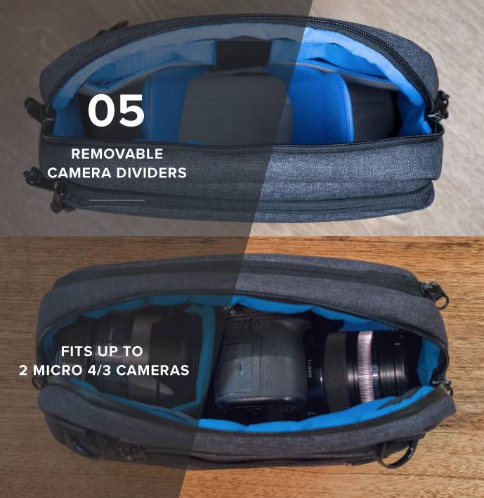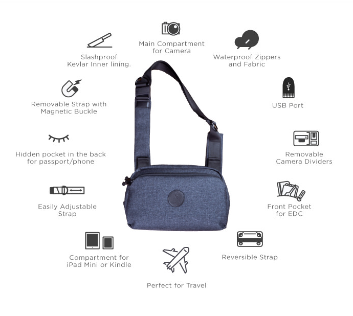 Với thiết kế trẻ trung, nhỏ gọn nhưng bạn dễ dang mang, bỏ vừa chiếc máy ảnh du lịch của mình. Bạn có thể để vừa 1 máy + 1 len ảnh một cách an toàn nhất. Chất liệu vải được sử dụng là sợi Kevlar, có độ bên gấp 5 lần thép. Hệ thống các chốt khóa chắc chắn, khóa kéo zipper chống nước, bạn có thể an tâm khi lỡ gặp trời mưa bất ngờ mà không lo hộ chiếu, máy ảnh của mình bị ướt